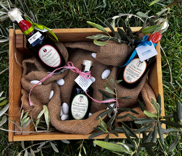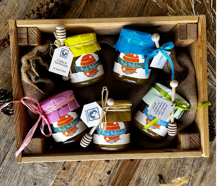 Puoi scegliere tra scatoline porta confetti personalizzabili, bottigliette d’olio extra vergine d’oliva e barattoli di miele.