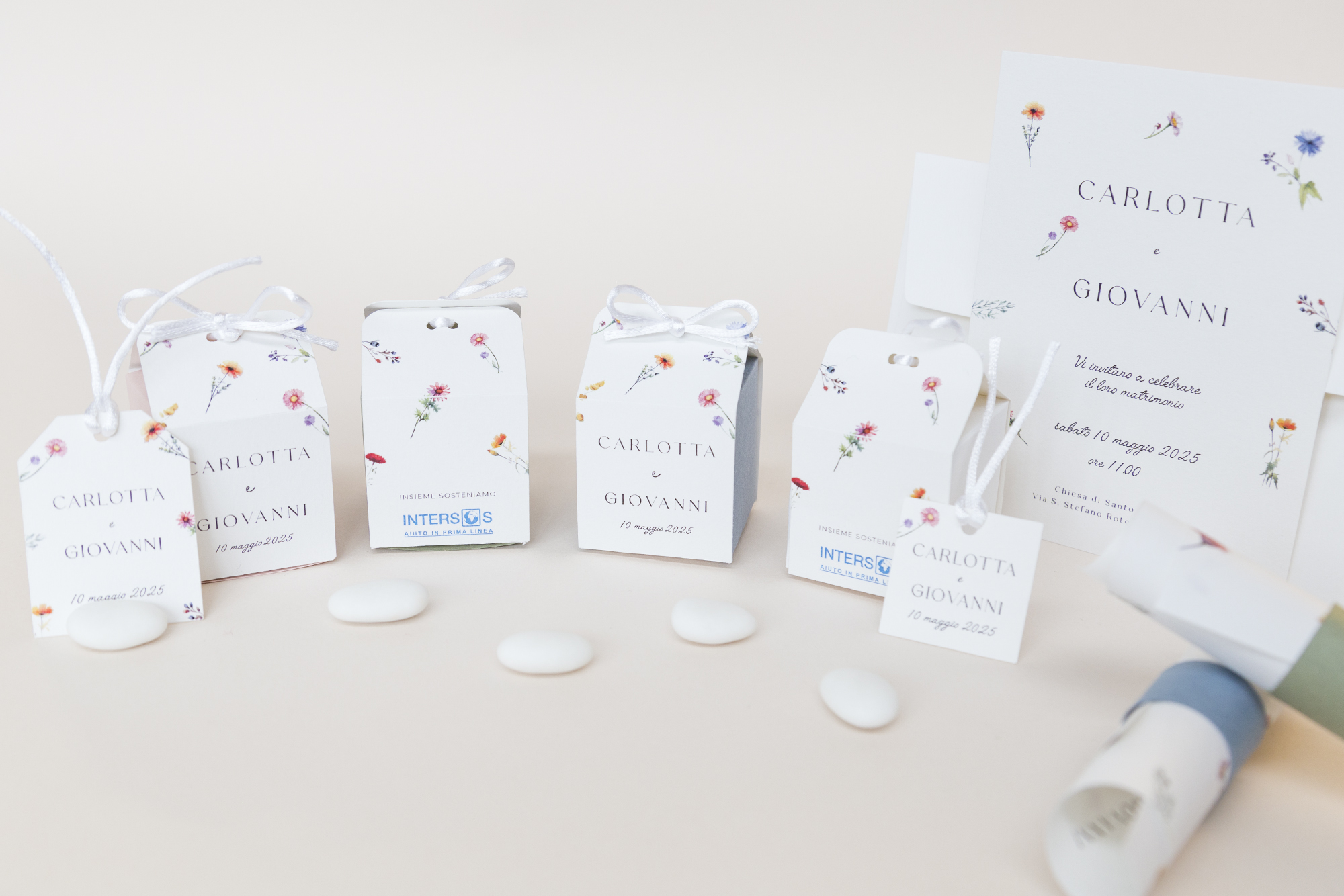Di vari colori e disegni le scatoline porta confetti sono tutte personalizzabili con il nominativo di chi festeggia e la data dell’evento. Sul retro della scatolina è riportata la frase “Insieme sosteniamo INTERSOS”.